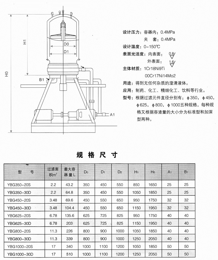 YGB系列葉板式過濾器: 是吸收西歐、日本同類設(shè)備的基礎(chǔ)上自行研制的一種新型高效過濾設(shè)備,可以得到無任何顆粒的澄清液體,廣泛應(yīng)用于制藥、精細(xì)化工、飲料等行業(yè)。該設(shè)備符合國際國內(nèi)制藥行業(yè)GMP要求及美國FDA的要求。 特點: 1.過濾體積大,速度快。 2.24層過濾網(wǎng),過濾充分且精度高,可達(dá)到0.2微米。 3.容器外殼設(shè)有夾套,可滿足不同工藝要求的濾液要求 4.過濾材料廣泛,使用后該設(shè)備還有反沖洗操作,使過濾材料在原位置再生無需打開清洗。 5.整個過濾工藝過程全封閉操作,不會受到外界污染。 6.適應(yīng)不同品種濾液要求,實現(xiàn)一機(jī)多用。